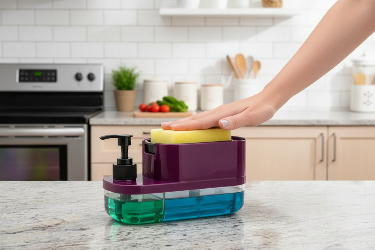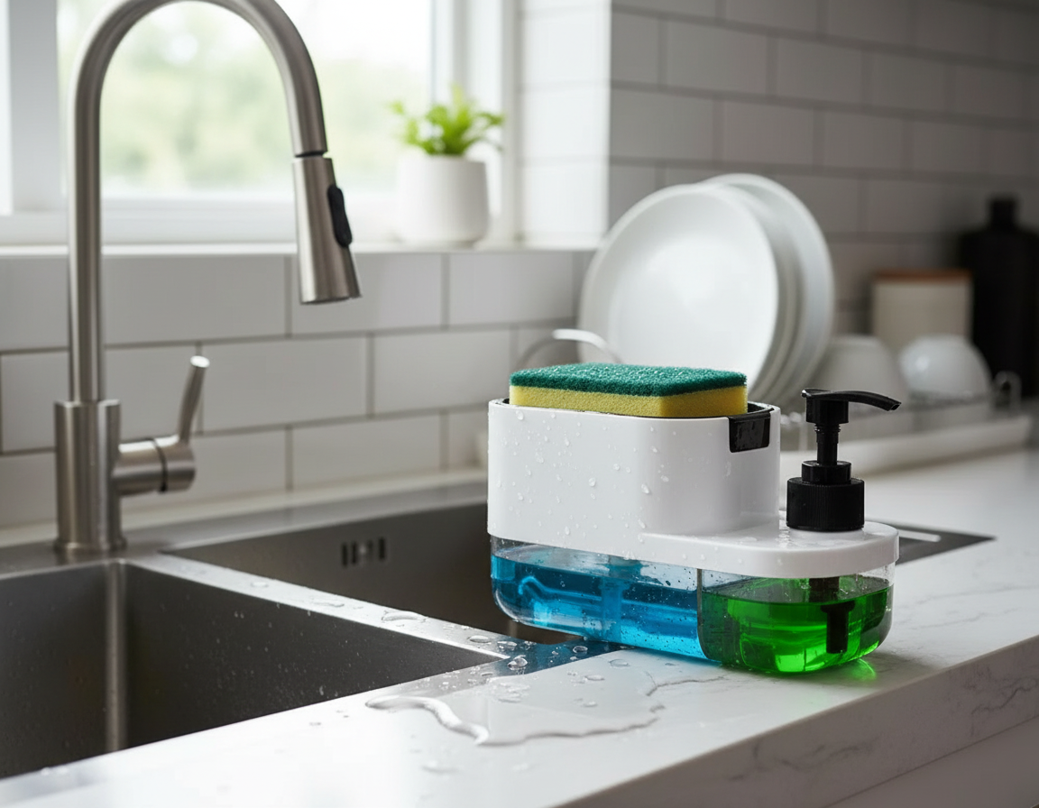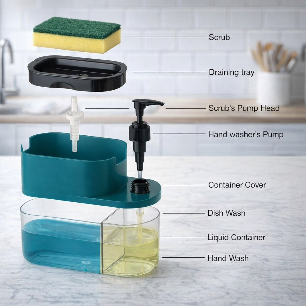 Upgrade your kitchen cleaning routine with the innovative 3-in-1 Kitchen Soap Dispenser, the ultimate all-in-one solution for a clutter-free and efficient sink area. Designed with practicality, durability, and modern aesthetics in mind, this multifunctional dispenser transforms the way you organize your soaps, sponges, and dishwashing essentials. Combining convenience with style, it is the perfect addition to any kitchen, whether you are a busy professional, a home cook, or someone who simply values order and efficiency. This multifunctional soap dispenser is engineered with dual liquid compartments that allow you to store two types of liquids simultaneously—ideal for dishwashing liquid and hand soap. The clear compartments are color-coded with green and blue liquid storage, making it simple to identify the soap you need at a glance. No more guessing which bottle to grab, and no more extra clutter around your sink. Each compartment is spacious enough to hold a generous amount of liquid, reducing the frequency of refills and ensuring your kitchen remains ready for everyday use. The built-in pump mechanism is ergonomically designed for effortless operation. A simple press delivers the perfect amount of soap every time, helping to reduce waste and prevent messy spills. Unlike traditional bottles, this dispenser provides a controlled flow, so you can achieve efficient cleaning without overusing soap. The smooth and responsive pump is designed to last, standing up to daily kitchen tasks without losing its effectiveness or reliability. One of the most practical features of this 3-in-1 dispenser is its integrated sponge holder. The holder keeps your sponge upright, allowing it to drain and dry quickly, which reduces the growth of bacteria and keeps your kitchen more sanitary. No more soggy, smelly sponges sitting on your countertop. The thoughtful design ensures that the sponge stays within reach while keeping your sink area organized and visually appealing. Crafted from high-quality, shatter-resistant plastic, this soap dispenser is built to last. Its glossy finish and modern design add a touch of elegance to your kitchen countertop, blending seamlessly with any decor style. The durable material resists cracks and leaks, ensuring long-term use without compromising functionality. Additionally, the transparent compartments allow you to monitor soap levels easily, so you’ll never run out unexpectedly. Space efficiency is a key feature of this multifunctional dispenser. Its compact footprint fits comfortably on any sink or countertop, maximizing available space without cluttering your kitchen. The thoughtful design makes it perfect for small kitchens, apartments, or even office kitchenettes. By combining multiple functions into one unit, it eliminates the need for multiple bottles and accessories, streamlining your cleaning supplies into one neat, convenient station. Refilling is simple and mess-free. Each compartment features an easy-to-access top opening, allowing for fast and efficient refills without removing the entire unit from the sink. This ease of maintenance ensures that the dispenser remains both functional and hygienic at all times. Its straightforward design requires no complicated setup, making it ideal for anyone, regardless of age or experience. The 3-in-1 Kitchen Soap Dispenser is not only practical but also versatile. While primarily designed for kitchen use, it can also be used in bathrooms or laundry areas for organizing hand soap, dish soap, or cleaning liquids. Its multifunctionality makes it a smart investment for any household, providing long-term value and convenience. This product also makes a thoughtful gift. Whether for housewarmings, weddings, or holidays, the sleek design and functional benefits make it an ideal present for friends and family. By helping someone organize their kitchen and simplify cleaning, you provide both practicality and style in one elegant package. In summary, this 3-in-1 Kitchen Soap Dispenser combines functionality, style, and convenience into one compact and efficient unit. With dual liquid compartments, a built-in sponge holder, durable construction, and easy-to-use pump mechanism, it is designed to simplify your kitchen chores while keeping your sink area neat and attractive. Enhance your daily cleaning routine, reduce clutter, and enjoy a more organized kitchen with this indispensable kitchen accessory. Invest in this multifunctional soap dispenser today and experience the perfect blend of efficiency, hygiene, and aesthetic appeal. With its thoughtful design and practical features, it promises to become an essential part of your kitchen, saving time, space, and effort every day. Whether for personal use or as a gift, this 3-in-1 soap dispenser is a must-have solution for modern kitchens that value both functionality and style.
