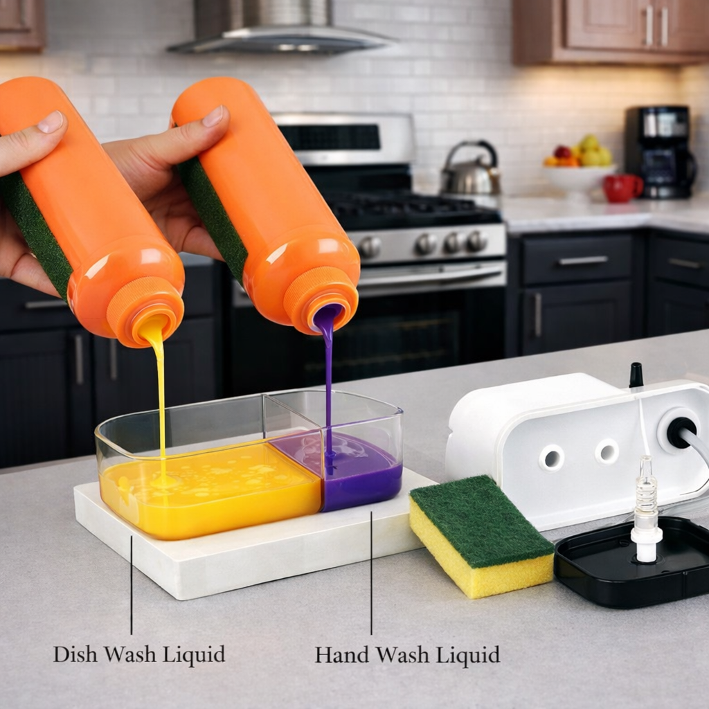 • Durable & Stylish Design: Crafted from high-quality, shatter-resistant plastic with a sleek glossy finish, this multifunctional dispenser adds a touch of modern elegance to your kitchen while standing up to daily use. Its vibrant dual-color liquid compartments make it easy to distinguish between soaps at a glance