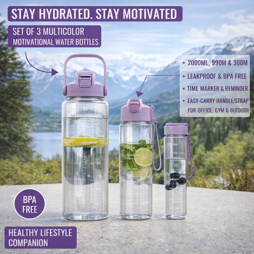 - 📦 Perfect Set of 3 for Multiple Uses:This set includes three bottles in different sizes, allowing you to use them for different purposes such as morning hydration, gym workouts, office desk use, or travel. It also makes a thoughtful gift choice for birthdays, wellness lovers, students, and fitness enthusiasts.
